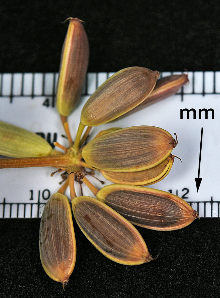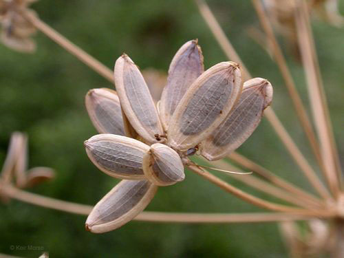 Bisexual flowers produce dry, two-seeded fruits (schizocarps). Schizocarps are flattened dorsally, oblong to oval, 0.4 to 0.6 inch (1-1.6 cm) long, 0.2 to 0.4 inch (0.4-1 cm) wide, and have flat-winged edges. Schizocarps include two mericarps (seeds) that remain attached along their midlines until ripe. A single umbel can produce hundreds of seeds.