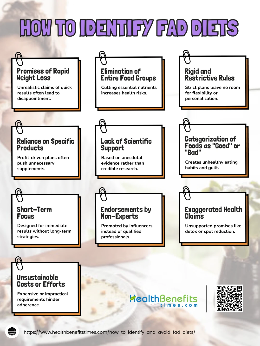 - Exaggerated Health Claims: Fad diets may claim to detoxify the body, target fat loss in specific areas, or cure diseases without credible evidence.