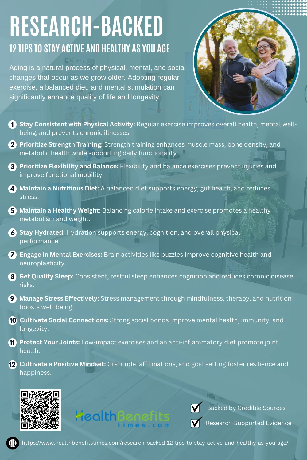 Embracing an active, healthy lifestyle as you age is essential for maintaining vitality, independence, and overall well-being. By incorporating these research-backed tips into your daily routine—like staying physically active, eating a balanced diet, prioritizing mental health, and cultivating social connections—you can enhance your quality of life and reduce the risk of chronic illnesses. Remember, small, consistent efforts lead to significant, long-term benefits. Aging is a journey, and with the right habits, you can make it a vibrant and fulfilling one. Start today, and invest in your healthiest, happiest years ahead!