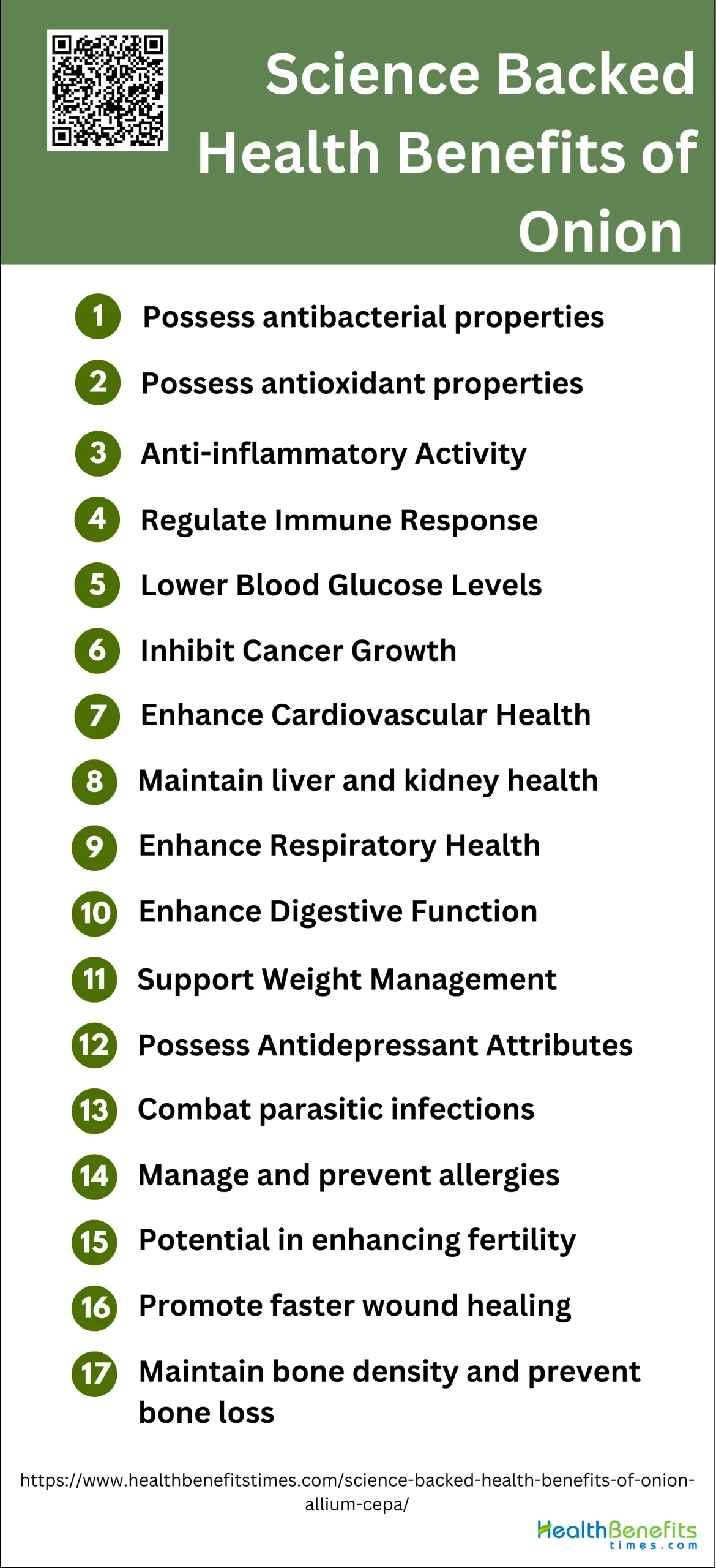 Onion is a remarkable vegetable that offers a multitude of science-backed health benefits. Its rich composition of bioactive compounds, including flavonoids like quercetin, sulfur-containing compounds, and phenolic acids, contribute to its potent antimicrobial, antioxidant, anti-inflammatory, and anti-diabetic properties. Onions have demonstrated significant potential in inhibiting cancer growth, preserving heart health, defending the liver and kidneys, and regulating immune responses. Additionally, they exhibit anti-depressive, parasitic inhibition, and allergy prevention benefits, while supporting reproductive health, wound healing, and bone health. With its diverse therapeutic effects and culinary versatility, incorporating onions into a balanced diet can be a valuable strategy for promoting overall well-being and potentially mitigating various health conditions.