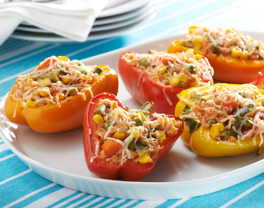 Most children like eating bell peppers as a snack, raw, sliced and served with a topping such as cheese. However, you can also stuff them with eggs and tomatoes to make a healthy lunch meal.