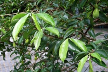 Simple, alternate; petiole 4-6 mm long; blade elliptical-oblong to oblong-lanceolate, 7.5-12 cm × 2.5-5.5 cm, chartaceous to subcoriaceous, glabrous, sometimes pubescent and glabrescent beneath, shiny on both surfaces, base acute, attenuate or obtuse, apex acuminate, acumen up to 2 cm long; veins in 12-16 pairs, rather irregular, often branched, elevated and distinct beneath, curving upward to the margin, plane or obscure above.