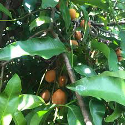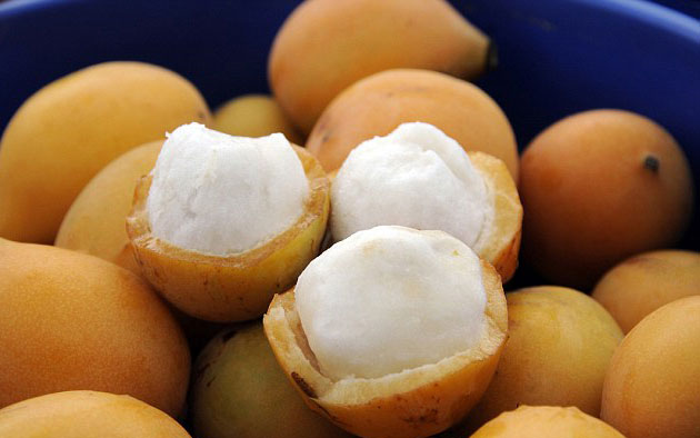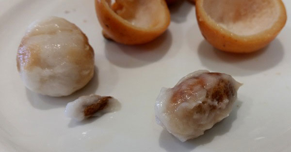 Fertile flowers are followed by smooth ovoid to ellipsoid berry with hard thick skin. The fruit is similar in size and shape to an egg. It is up to 5.5–6 cm long and 4.4–5 cm across at the equatorial diameter and has an average weight of 50 grams. The fruits are bluish-green color when immature to a yellowish-orange and then changes to orange-reddish color as it ripens. Skin is firm and protective, yet quite easy to open. White interior flesh separates easily from the pericarp, containing 1-4 seeds. Seeds are brown, oval, poly embryonic, large 3.0–3.5 cm long and 1.5–2 cm wide surrounded in white acidic sweet pulp. Seeds exude yellow sap when cut.
