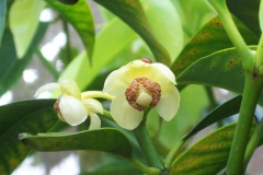 Flowers are hermaphrodite, 4-5 white flowers occur on 2 cm long pedicels. Hermaphrodite flowers are 17–36 mm long with, 20–34 stamens, 2 sepals, 4 white, imbricate petals and an ovoid ovary. Male flowers are 9.5–12 mm long, with 26–28 stamens and a vestigial ovary.
