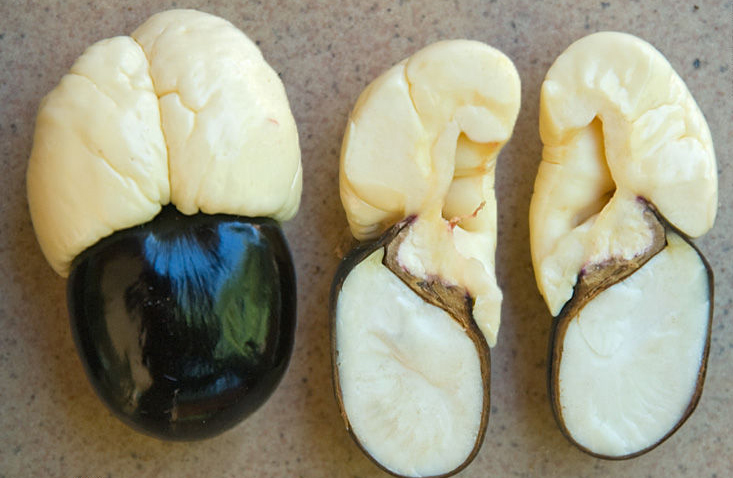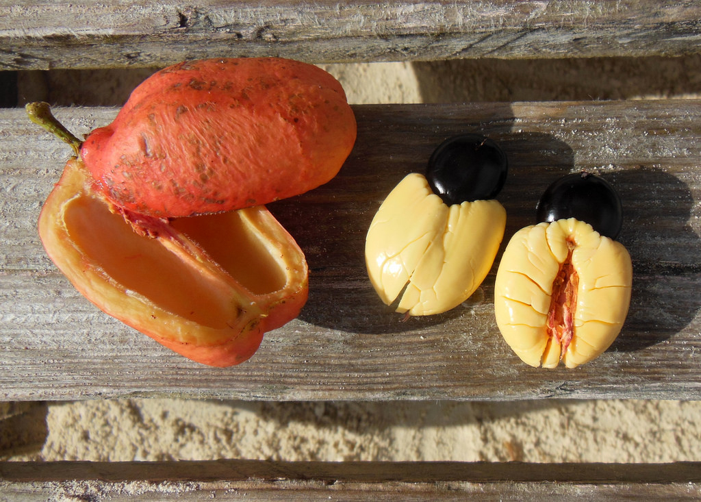 The name Ackee is derived from the West African name “Akye Fufo”. It is native to forests of the Ivory Coast and Gold Coast of West tropical Africa. Ackee, Akee, Akee Apple, Aki, Savory Akee Tree, Vegetable Brain are some of the common names of the Ackee. Ackee is the national fruit of Jamaica and is enjoyed as a prepared breakfast dish or as a lunch or dinner entrée. When fruit ripe on the tree, it opens to reveal three large black shiny seeds surrounded by a bright yellow flesh. The yellow flesh around the seed is edible; the rest of the fruit contains toxic levels of hypoglycin A and B, which can cause mild to severe vomiting, convulsions, coma and even death in some cases.