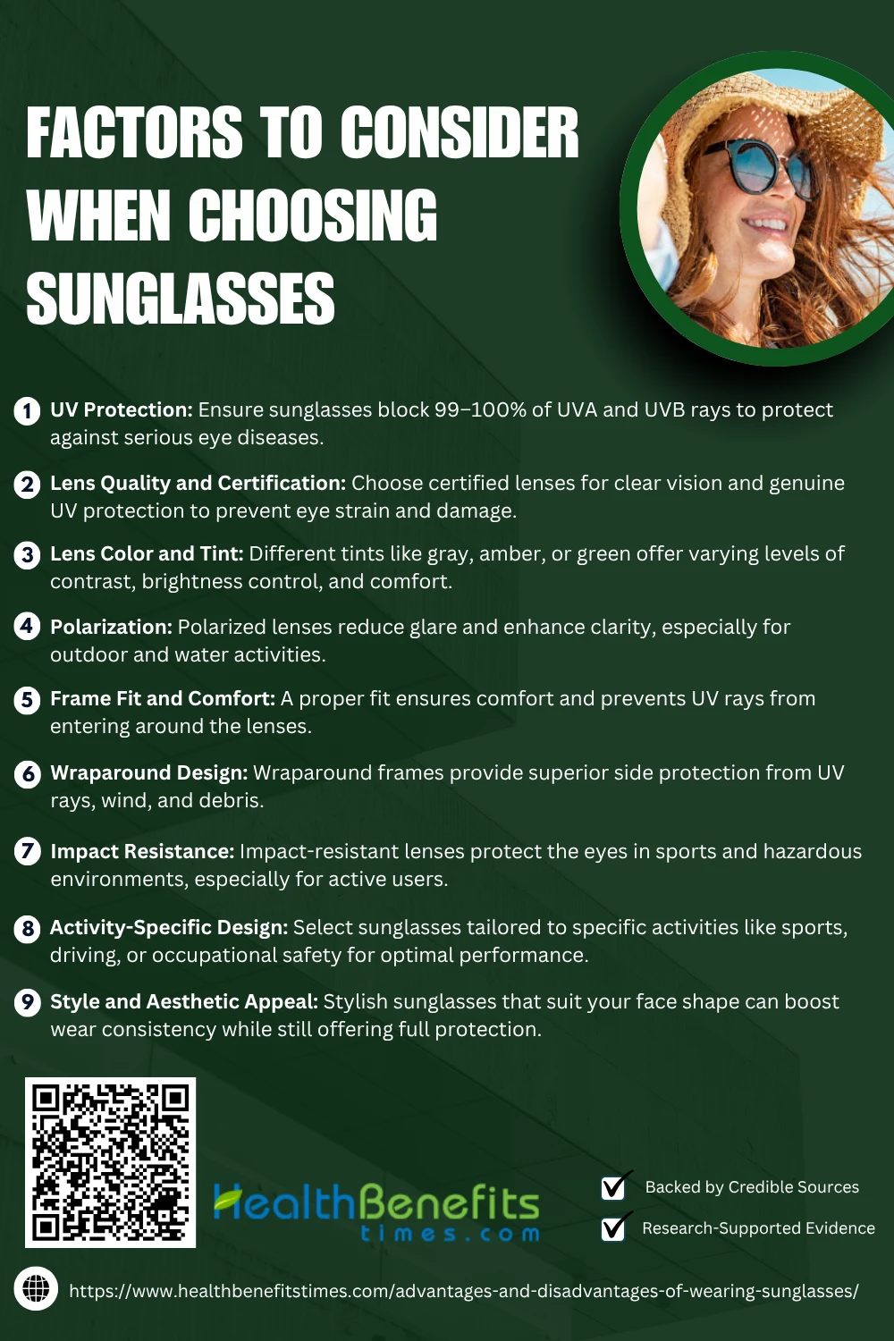 Choosing the right sunglasses involves more than style. Key factors include UV protection, lens quality, fit, frame material, and intended use to ensure both eye safety and comfort.