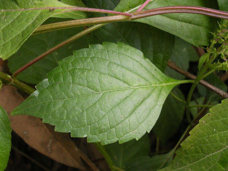 Leaves are opposite, broadly to narrowly ovate, usually 5-13 cm long and 3-9 cm wide, both surfaces copiously glandular punctate, upper surface is glabrate to sparsely puberulent while lower surface is puberulent on veins. Margins are serrate, apex acuminate, base cuneate while petioles are 1-6 cm long.