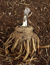Root Tuberous rootstock or corm, is hard, fleshy, mucilaginous and dark brown or black on the outside and yellow-orange inside when freshly cut.