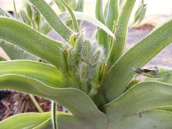 Leaves are linear to broadly lance-shaped, slightly hairy which are to 400 mm long, neatly arranged one above the other in 3 ranks, broad, stiff and arching outwards with prominent ribs and tapering towards the tips. The lower surface of the leaves is densely hairy with white hairs. Leaves appear above ground in spring before the flowers.