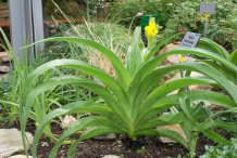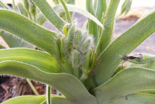 Leaves are linear to broadly lance-shaped, slightly hairy which are to 400 mm long, neatly arranged one above the other in 3 ranks, broad, stiff and arching outwards with prominent ribs and tapering towards the tips. The lower surface of the leaves is densely hairy with white hairs. Leaves appear above ground in spring before the flowers.