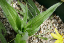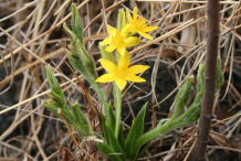 Flowers are carried on 5 or 6 slender erect inflorescences, each carrying 5-13 bright yellow, star-shaped flowers with 6 tepals. Six free stamens arise from the base of the tepals with prominent anthers. The style is short and fat, carrying the robust stigma.