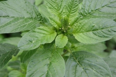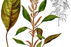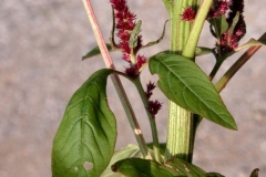 Several unisexual flowers are green and form finger-like spikes with long and dense terminal panicle and axillary spikes below. The terminal spike is often lax. There are 5 tepal segments, which are lanceolate, acute, 2-3 mm long, with a sharp and long tip, causing the inflorescence to feel distinctly prickly. Five, 1 mm long stamens form a male flower, while the female flower is a 1-celled ovary crowned by 3 stigmas. At maturity, the whole plant may be reddish. The large and complex inflorescence consists of numerous concentrated cymes arranged axillary, ended with racemes and spikes. The top one, with numerous laterals, is perpendicular, with thin branches up to 45 cm long. There 2-3 mm long bracts. The inflorescence is more than 50 cm long, characterized by high color variability. Flowering normally takes place in between July to September.