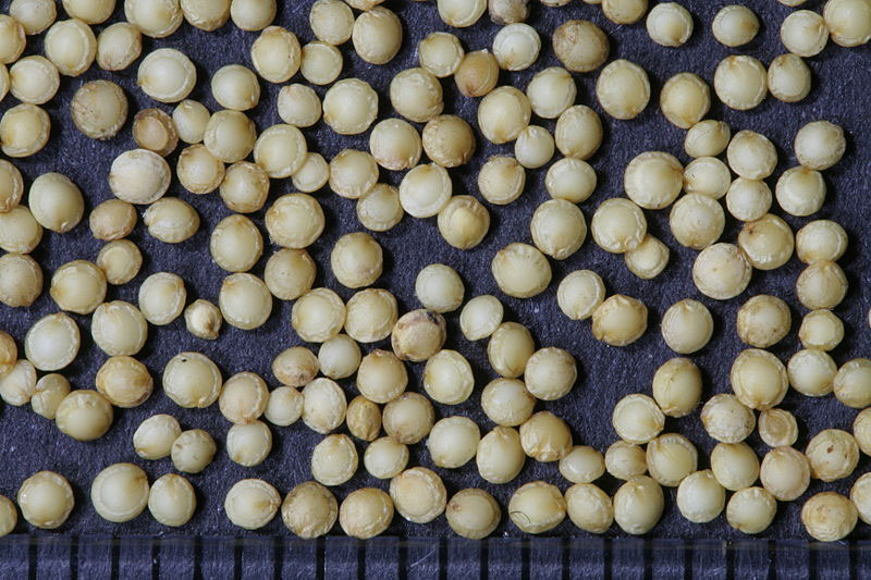 Each of them produces about 50 000 seeds in round or more often in lenticular shape, 1-1.5 mm in diameter, shiny, and dark brown. The mass of 1000 seeds is around 0.6-1.0 g. Grains are lenticular, with a color that varies from white, pink, through gold and brown to black. The coat of the seed is smooth and thin. The germ is campylotropous, which is caused by the shape of the seed and they are bent down and surround the perisperm like a ring. The perisperm is the main seed storage. Endosperm is present only in the micropylar area of the seed.
