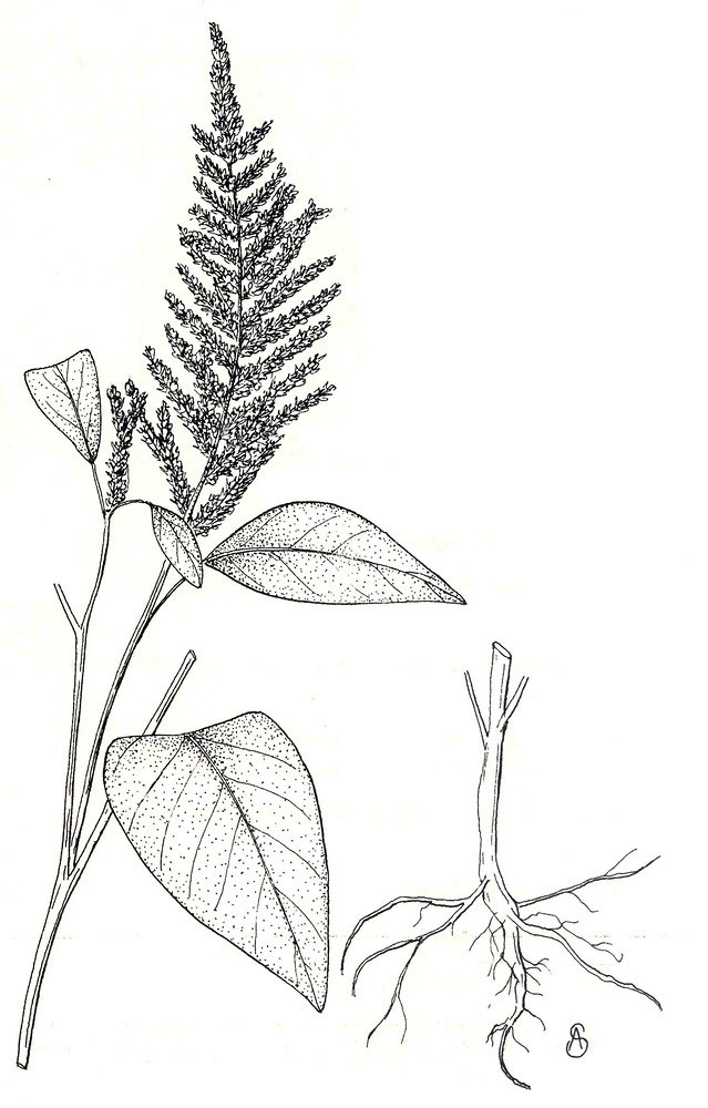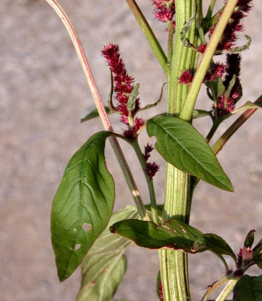 Several unisexual flowers are green and form finger-like spikes with long and dense terminal panicle and axillary spikes below. The terminal spike is often lax. There are 5 tepal segments, which are lanceolate, acute, 2-3 mm long, with a sharp and long tip, causing the inflorescence to feel distinctly prickly. Five, 1 mm long stamens form a male flower, while the female flower is a 1-celled ovary crowned by 3 stigmas. At maturity, the whole plant may be reddish. The large and complex inflorescence consists of numerous concentrated cymes arranged axillary, ended with racemes and spikes. The top one, with numerous laterals, is perpendicular, with thin branches up to 45 cm long. There 2-3 mm long bracts. The inflorescence is more than 50 cm long, characterized by high color variability. Flowering normally takes place in between July to September.