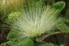 Albizia lebbeck is an unarmed and deciduous tree which is 20 m (65 ft.) tall with round, spreading or umbrella-shaped crown and pale grey to dark brown, rough and irregularly cracked bark. Leaves are alternate with 2 to 5 pairs of pinnae. Each pinna has 3-10 pairs of leaflets which are elliptic to oblong, asymmetrical at base, dull green above, paler green below and about 2-4 cm (1-2 in) long. Flowers are showy and rounded clusters near stem tips, cream or yellowish-white and 5-6 cm (2-2.5 in) across. Each flower has long and numerous stamens. Flowers are followed by flat and linear pod about 30 cm (1 ft) long with numerous seeds.