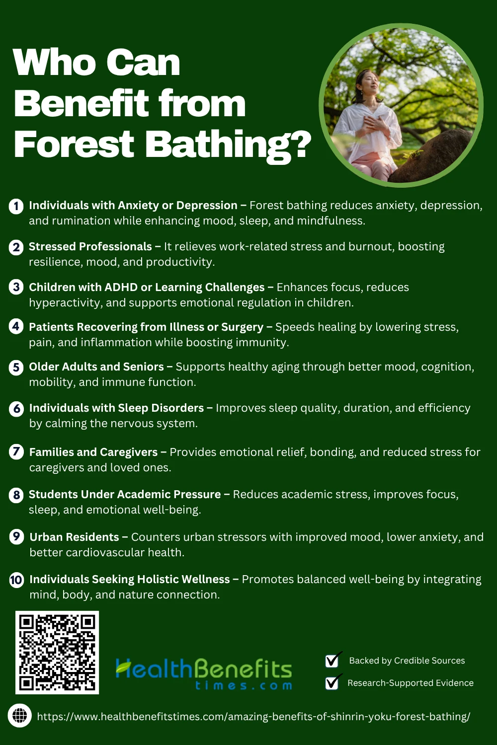 Forest bathing offers healing benefits for everyone—children, adults, seniors, and even those with chronic stress or illness. Its calming effects support mental clarity, emotional balance, and physical health naturally.