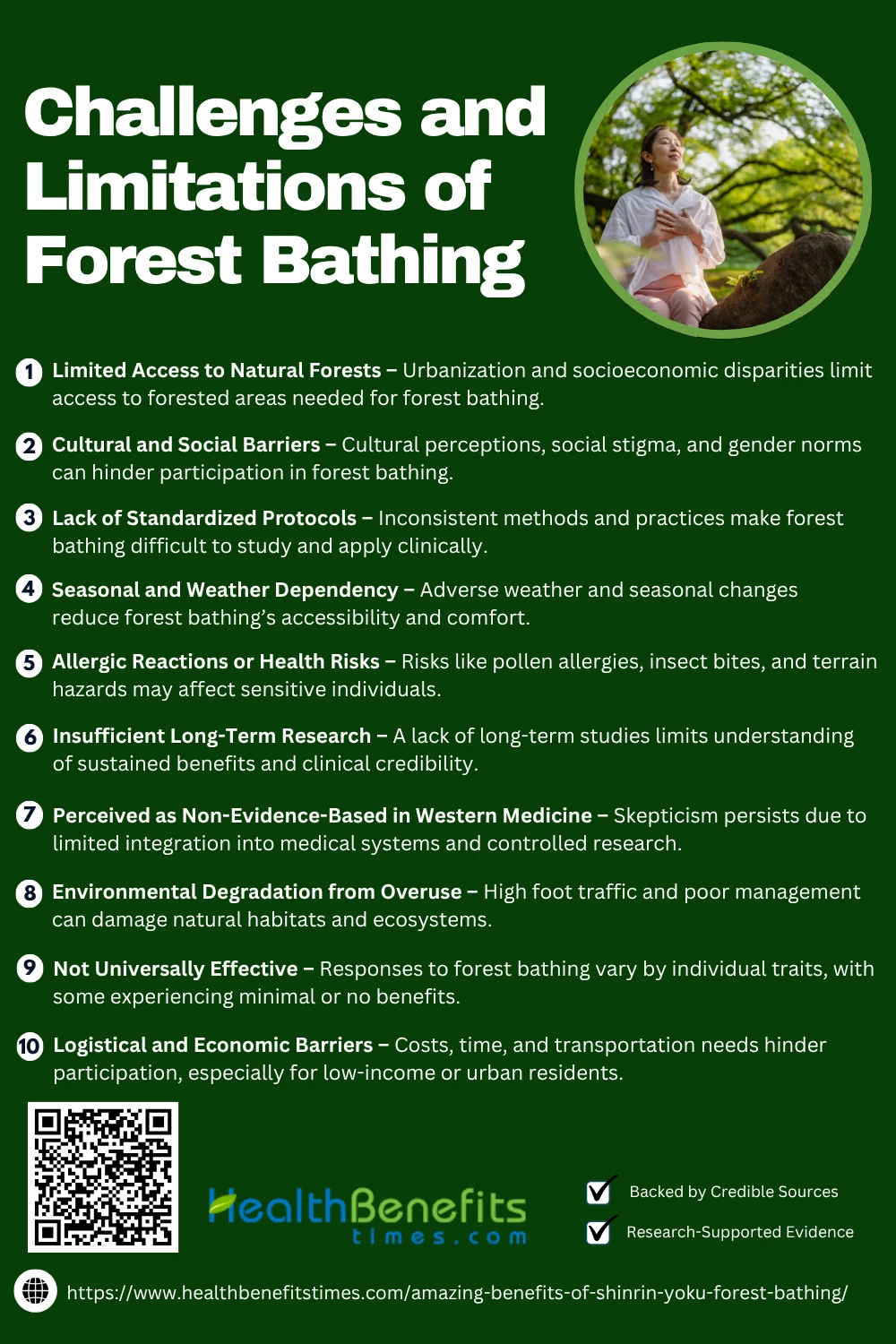 While forest bathing offers many benefits, it also faces challenges such as limited access to green spaces, time constraints, environmental factors, and skepticism about its effectiveness without scientific understanding.