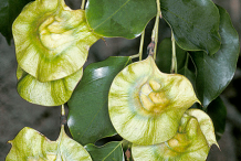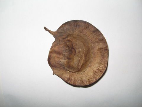 Flowers are followed by pods that are thin, papery winged, disc-shaped, about 5–6 cm (2–2.4 in) across, and borne in clusters. They are light green, turning dull brown when fully mature. Pods consist of contains one or two seeds, and does not split open at maturity; it ripens within 4–6 years, and becomes purple when dry. Seeds are flattened, bean-shaped, 6–8 mm (0.2–0.3 in) long with a leathery, although rather brittle, seed coat. Pod/ seed dispersal is mainly by wind. Pods can float, and water dispersal is likely to also be significant for riverine populations.