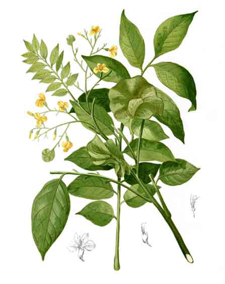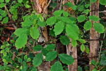The bright green, imparipinnate leaves are arranged alternately on the branchlets. Trees are either briefly fully deciduous or may be evergreen in uniformly humid zones. The new flush of leaves is light green, turning dark mid-green. Each leaf has (5–) 7–9 (–11) alternately arranged, ovate leaflets; each leaflet is about 6–12 cm (2.4–4.8 in) long by 3–7 cm (1.2–2.8 in) wide, with an entire margin. The terminal leaflet is larger, with the smallest leaflets in the lowest pair on the rachis.
