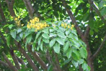 Flowering is often initiated before the new leaf flush but continues after leaf flushing. Flowering takes place in several short bursts of about 1–2 days duration. The pea-shaped flowers are bright yellow to orange-yellow, about 1.5 cm (0.6 in) long, fragrant, and arranged in branched axillary racemes. The flowers are borne in profusion, adding to the ornamental appeal of trees when in full flower. Seasonality of flowering varies geographically.