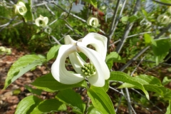 Flowers occur in small, greenish-yellow and inconspicuous clusters at center and above four large and showy white to pinkish bracts. The flower blooms in late April or May.