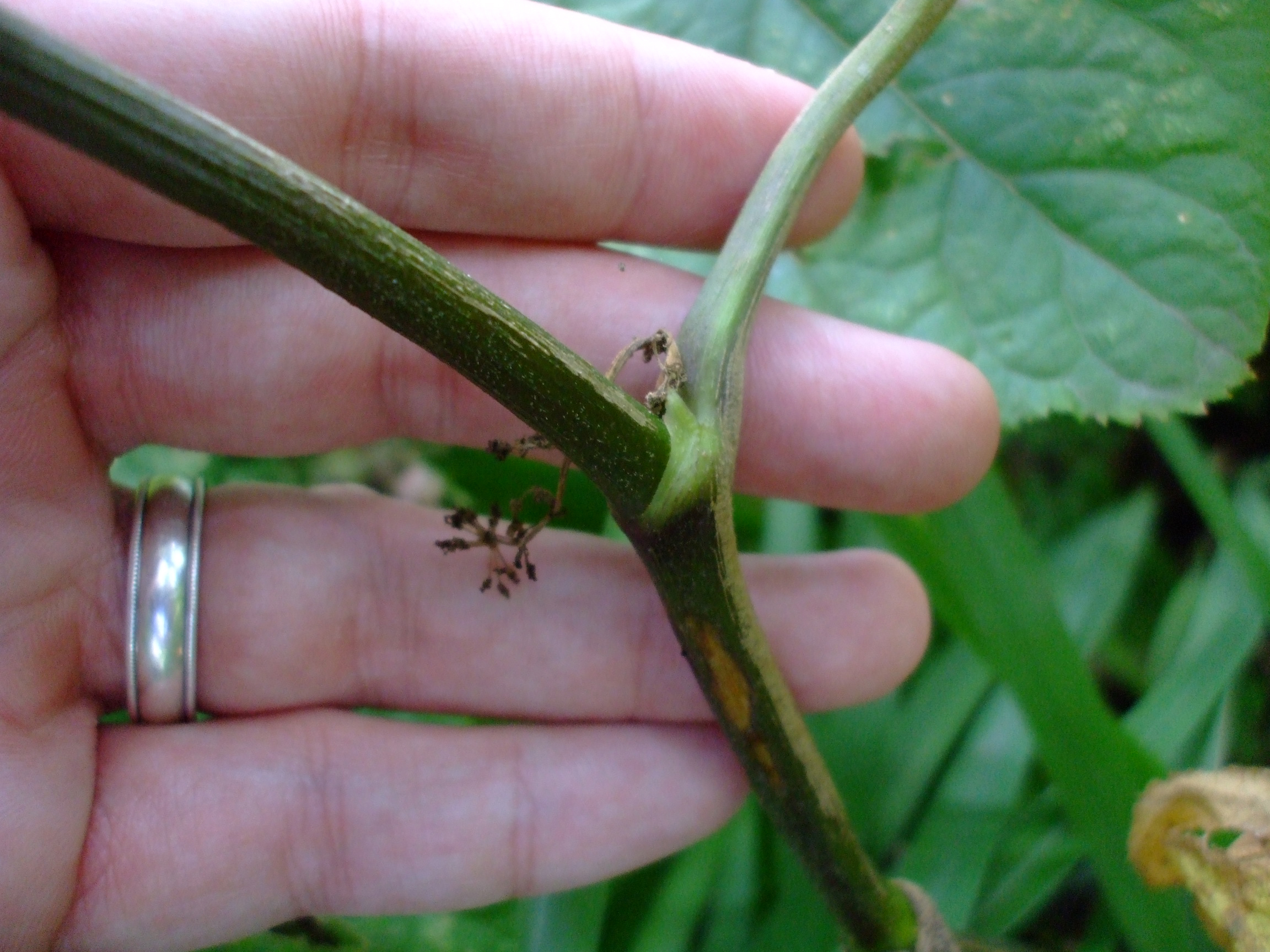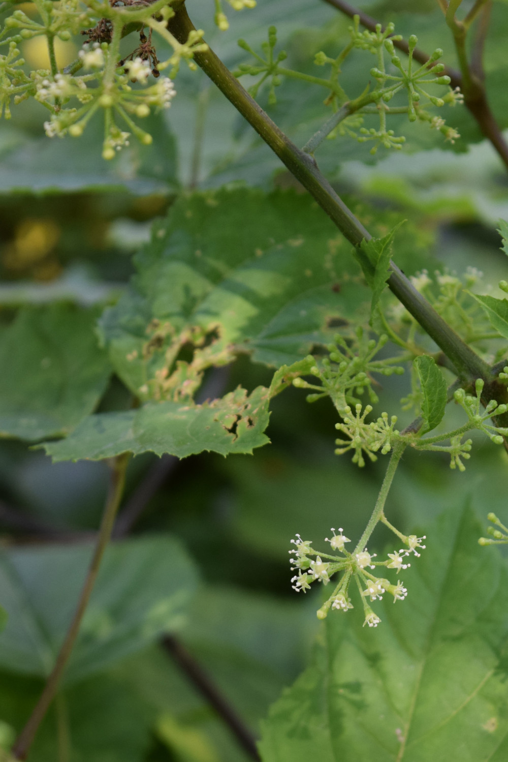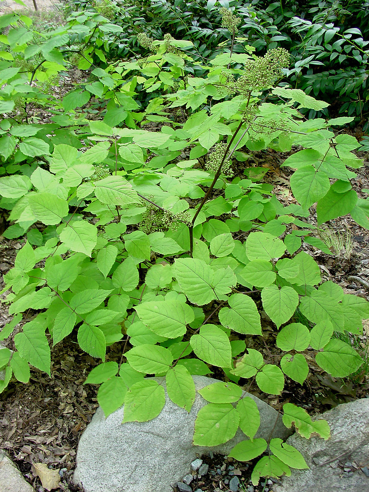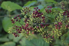 This perennial herbaceous forb grows on shrubby stems usually 7 feet high. Stems are much branched on older plants without thorns, hair and turns dark maroon color as the season progress. Leaves are large, oval with 3 and 5 pinnates. Flowers are small, green that forms laterally from axils or in spikes at end of the plant in long, paniculated and spherical umbels. Berries are round and dark red or purple. The flower blooms from July to August.