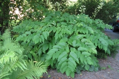 Leaves are twice compound, large over 2 feet long and nearly as wide. Leaflets are oval, 5 ½ inches long and heart shaped at the base tapering sharply pointed tip, sharply toothed and has fine hairs along underside veins on slender stalks. Stems are dark maroon, stout and generally smooth and covered in short and fine hairs.