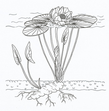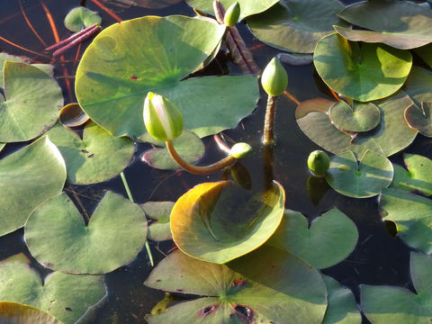 American white water lily is a perennial Strong-rooted aquatic herb that grows about 0.5–2 m (1.5–6.5 ft.) tall. The plant is found growing in acidic or alkaline ponds, lakes, sluggish streams and rivers, pools in marshes, ditches, canals, or sloughs, protected areas of lakes, and clear slow-moving rivers, particularly where dams have been constructed. The plant grows to the surface of the water from a thick horizontal root-stock, stem is absent. It consists of blackish, large, fleshy perennial rhizome.