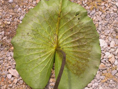Leaves are always floating orbicular, smooth, and shining, dark green above, wine-color beneath. They are narrowly and deeply cut almost to the center, where the stem is attached.