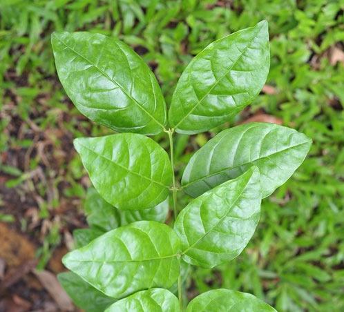 Leaves are opposite or in whorls of three, entire, elliptic or broad elliptic to sub orbicular, obtuse at both ends, very variable in size, up to 4 to 12.5 cm (1.6 to 4.9 in) long and 2 to 7.5 cm (0.79 to 2.95 in) wide, glabrous, shining green above, nerves 4–6 on each side of midrib prominent beneath; petiole short, pubescent. They are smooth (glabrous) except for a few hairs at the venation on the base of the leaf.