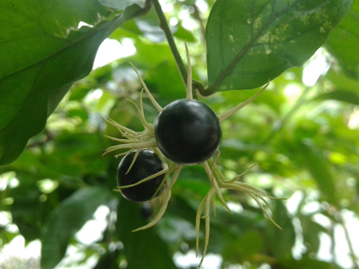 Fertile flowers are followed by simple or didymous, globose berry that is 1 cm (0.39 in) in diameter. The fruit is initially green turning to purplish black as they mature.