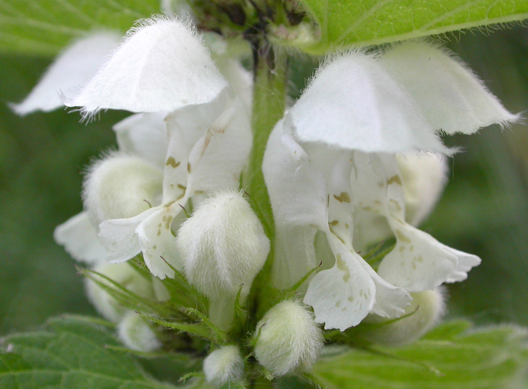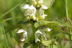 It is an herbaceous perennial plant growing to 3 feet (90 cm), with green, four-angled stems. Like many other members of the Lamiaceae, the leaves appear similar to those of the unrelated stinging nettle (Urtica dioica) but do not sting, thus the common name “deadnettle.” The flowers are white, with a lobed bottom lip and hooded top lip. They evolved like this to attract pollinating bees which use the lower lip as a landing pad while they take the nectar from the bottom of the flower tube. At the same time the bee brushes against the stamens that dangle from the hood, collecting pollen to transfer to the next flower.