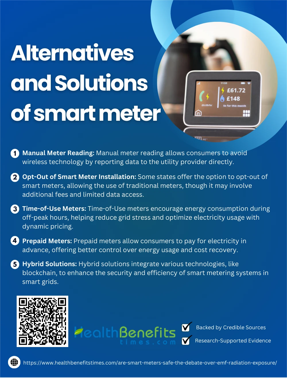 For those concerned about smart meters, alternatives include opting for traditional analog meters or using EMF shielding devices. Solutions also involve reducing exposure by limiting proximity to smart meter installations.