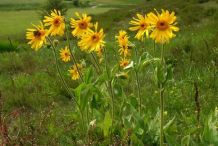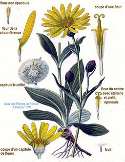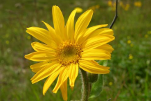 Arnica is a perennial, herbaceous plants growing about 0.3 to 0.6 m (1 to 2 feet) tall. The plant is found growing in grassland and shrub land and alpine mountain environments and prefers a moist, well-drained humus rich soil, preferably lime-free. It has dark brown, cylindrical, usually curved rhizomes and slightly hairy, simple or lightly branched stem. Basal leaves are oblong-ovate and short-petioled; upper leaves are smaller and sessile. Later plant produces 1 to 9 large, yellow, daisy-like flower heads, 6–8 cm (2–3 in) wide with 10–15 cm (4–6 in) long ray florets and numerous disc florets. Flower later develops into seed like fruit with white or pale tan bristles. Arnica is toxic when consumed at full strength, but it can be used as an ointment, gel or cream on unbroken skin or taken internally when it is diluted homeopathically. It is applied to the skin for pain and swelling associated with bruises, aches, and sprains. It is also applied to the skin for insect bites, arthritis, muscle and cartilage pain, chapped lips, and acne. Similarly arnica is a flavor ingredient in beverages, frozen dairy desserts, candy, baked goods, gelatins, and puddings.