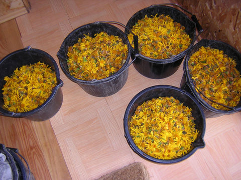 Harvest fully open arnica blossoms throughout the flowering season. Pick the flower heads on a sunny day after the morning dew has vanished. Spread the blossoms on a paper-lined tray to dry in a bright and airy room away from direct sun. Temperature in the drying room should be at least 70°F (21.1°C). When the blossoms are totally dry, store it in a dark glass container with an airtight lid. The dried herb will maintain medicinal potency for 12–18 months. Clearly label the container with the name of the herb and the date and place harvested.