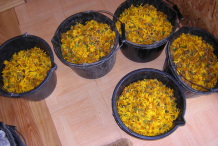 Cover the jar with its lid and place in a sunny spot throughout the day. Bring it inside at night, but repeat the process for a month. You can see the oil taking on the color and smell of the herbs. This is a slow infusion method where sun’s heat is used for the process.