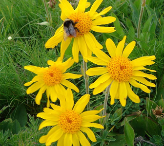 Arnica is a perennial, herbaceous plants growing about 0.3 to 0.6 m (1 to 2 feet) tall. The plant is found growing in grassland and shrub land and alpine mountain environments and prefers a moist, well-drained humus rich soil, preferably lime-free. It has dark brown, cylindrical, usually curved rhizomes and slightly hairy, simple or lightly branched stem. Basal leaves are oblong-ovate and short-petioled; upper leaves are smaller and sessile. Later plant produces 1 to 9 large, yellow, daisy-like flower heads, 6–8 cm (2–3 in) wide with 10–15 cm (4–6 in) long ray florets and numerous disc florets. Flower later develops into seed like fruit with white or pale tan bristles. Arnica is toxic when consumed at full strength, but it can be used as an ointment, gel or cream on unbroken skin or taken internally when it is diluted homeopathically. It is applied to the skin for pain and swelling associated with bruises, aches, and sprains. It is also applied to the skin for insect bites, arthritis, muscle and cartilage pain, chapped lips, and acne. Similarly arnica is a flavor ingredient in beverages, frozen dairy desserts, candy, baked goods, gelatins, and puddings.