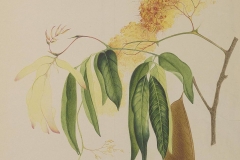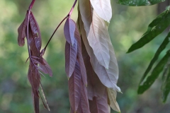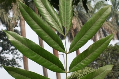 Leaves are stipulate, alternate, paripinnate compounds that spread horizontally. Rachis is stout, thickened, flexible, corky and 15 to 22.5 cm long. There are 8 to 12 leaflets and the lowest pair is close to the base on very stout, short and flexible stalks about 10-22.5 cm long, 3.1-3.7 cm broad and the middle ones are longest, linear which tapers to very acute apex. Stipules are large, intrapetiolar, stiff, ovate, deciduous, brown and about 1.2 cm long. There are 7 stamens with very long purple filaments which are inserted on fleshy lobed ring at mouth of calyx tube. Anthers are purple to black and ovary is superior, stalked, unilocular and unicarpellary.