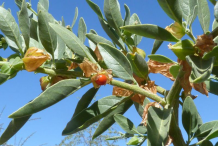 Fruits: Fruit is a berry enclosed in the green persistent calyx, 5 mm in diameter, smooth, more or less globose, green when unripe, orange-red coloured in ripening stage
