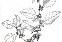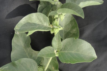 Leaves: Leaves are cauline and ramal, simple, exstipulate, petiolate, ovate, acute, entire, and up to 10 cm long. Petioles up to 1.25 cm long. The leaves on vegetative shoots are alternate and large while those on floral branches are opposite, rounded or somewhat produced at base, pubescent on lower surface and glabrous on upper surface unicostate, reticulate venation. Arranged in pairs of one large and one small leaf and arranged somewhat laterally, having in their axila cymose cluster of 5-25 inconspicuous pale green flowers.