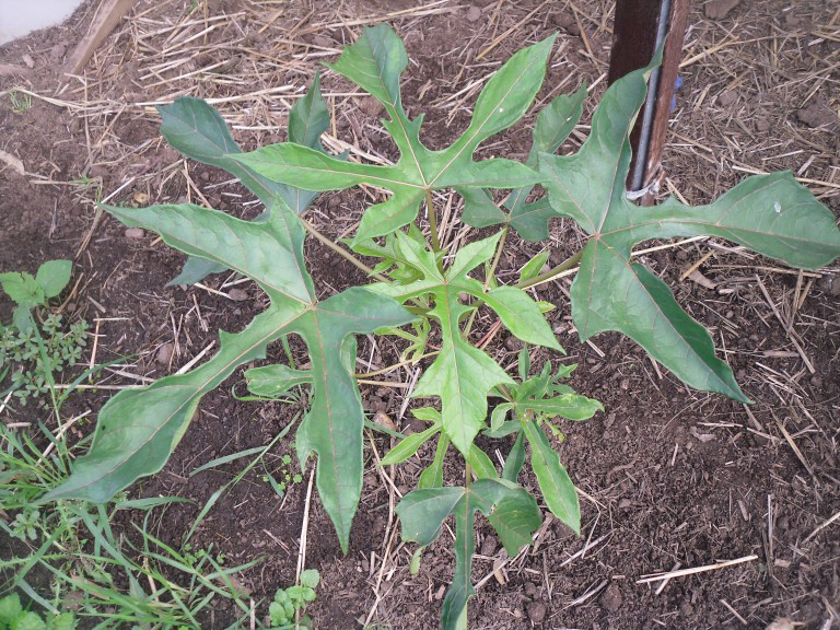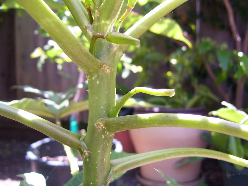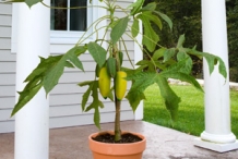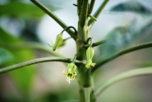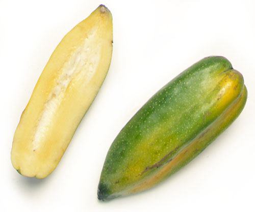 It is a small herbaceous shrub which measures 1.5 to 3 meters high with erect softwood and semi-lignous trunk associated with leaf scars such as papaya. It has shallow root system having flashy tuberous roots of 40 cm diameter and various lateral roots. Leaves are large, alternate, coriaceous, 40 cm across and palmate having 5 to 7 lobes. All flowers are female and solitary. Flowers measures 3.5 cm across and are campanulate with dark green sepals and yellow petals. Fruit is an aspermous berry in pentagonal shape with no seeds and ovarian cavity. It has five longitudinal ridges. Fruit turns from yellow to golden yellow when ripened and measures about 20 to 30 cm long and 12 to 18 cm wide. Flesh is thick, juicy and whitish to cream colored with juicy, acid to sweet taste.