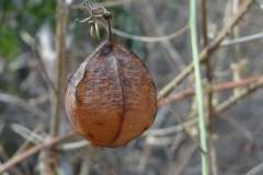 Fertile flowers are followed by seed capsule that is almost spherical. These capsules are thin-shelled, inflated and angled which measure up to 3cm in diameter. The fruits are initially green and maturing to light brown over autumn. When ripe it splits into three segments each with a single seed. Seeds are black, opaque and smooth with a white, finely porous heart–shaped spot at the micropyle and measures about 5 mm in diameter. The fruits are dispersed by water currents and at times by wind.