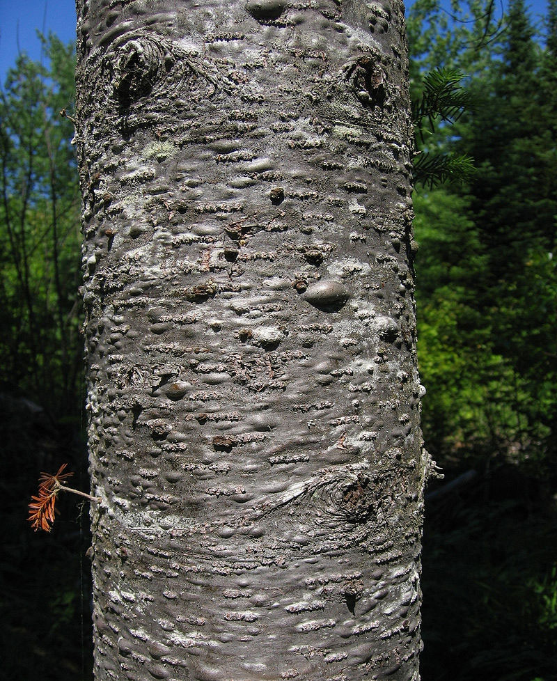 | Bark | Bark on young trees is smooth, grey, and with resin blisters (which tend to spray when ruptured), becoming brown, rough and fissured or scaly on old trees and are less than 0.5 inch (1.2 cm) thick |