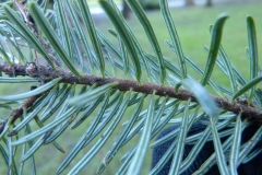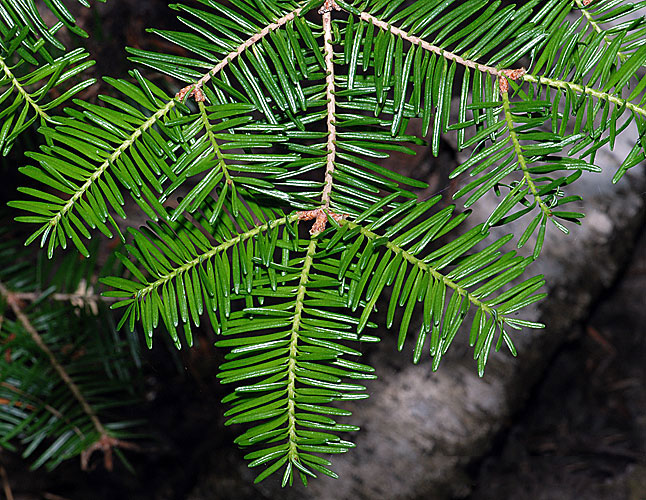 Resinous branches are densely clad with shiny, dark green needles (leaves). Leaves are flat and needle-like, 15 to 30 mm (5⁄8 to 1 1⁄8 in) long, dark green above often with a small patch of stomata near the tip, and two white stomatal bands below, and a slightly notched tip. They are arranged spirally on the shoot, but with the leaf bases twisted so that the leaves appear to be in two more-or-less horizontal rows on either side of the shoot. The needles become shorter and thicker the higher they are on the tree.