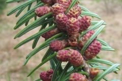 Male strobili are yellowish-red and tinged with purple; develop in the axils of leaves along the undersides of the 1-year-old twigs, usually in dense clusters. Their position in the crown is mostly within 5 m (15 ft.) of the top and is almost always below the female strobili. Female strobili are purplish and are found singly or in small groups, confined to the top 1.5 m (5 ft.) of the crown. They are located on the upper side of the twig and, like the male strobili, develop on the previous year’s twig. Flower production is best on the outer end of branches. At maturity, male flowers are about 3 mm (0.1 in) long; female flowers are about 25 mm (1.0 in) long.