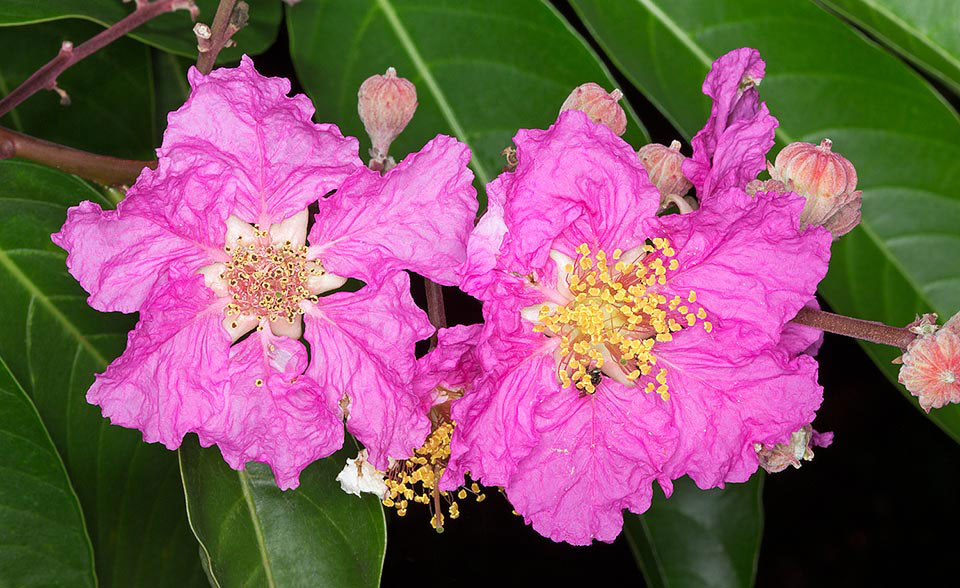Terminal panicle inflorescences are erect, 15-40 cm long, carrying numerous flowers, on a 1-1.5 cm long pedicel, of color varying from pale pink, to lavender, to purple pink, of 5-8 cm of diameter, lasting 2-3 days. The sepal is funnel or bell-shaped and 6(-9)-lobed. Petals are oblong-obovate or obovate, shortly clawed, and 3 to 3.5 centimeters long; the margins are undulate and hardly fimbriate. They are white to pink or purple, clawed and wrinkled. The stamens are many and in several rows. The ovary is superior, 3-6-locular with many ovules in each cell and with 1 style. Flowering normally takes place from April-June in Philippines, from July-October in Java and from May-July in Papua New Guinea.