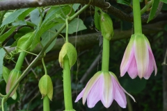 The large pale pink flowers are about 6 cm across and 9-10 cm long and are borne singly in the leaf forks on stalks that are 3-10 cm long. Flowers hang downwards and at the base of the each flower are pair of bracts that is 3-4 cm long and 2-3 cm wide that can be mistaken for sepals. Five sepals and five petals are all very similar in size about 4.5-6 cm long and 1.2-2.5 cm wide and color. Their bases are joined together, forming a very long and narrow greenish-colored floral tube 6-8 cm long and 7-10 mm wide. Each flower also has five stamens and a hairy ovary topped with three white styles ending in green stigmas. Flowering can occur throughout the year.