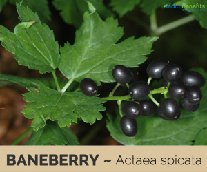 Baneberry is a poisonous herbaceous, perennial, flowering plant that grows about 0.5 m (1ft 8in)tall and spread 0.3 m (1ft) wide. The plant is found growing in moist shady areas, mostly in deciduous forests but also in mixed coniferous forests, open pine or spruce woodlands, swales, stream banks and swamps. The plants prefer humus-rich damp, stony woods. Plant has black, creeping root-stock that is short, oblique, woody and erects shiny stems, growing 1 to 2 feet high, which are triangular and either not branched, angularly curved from nodes, base with 3–4 scales. The whole plant is dark green and glabrous (without hairs), or only very slightly downy.
