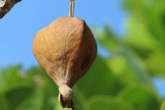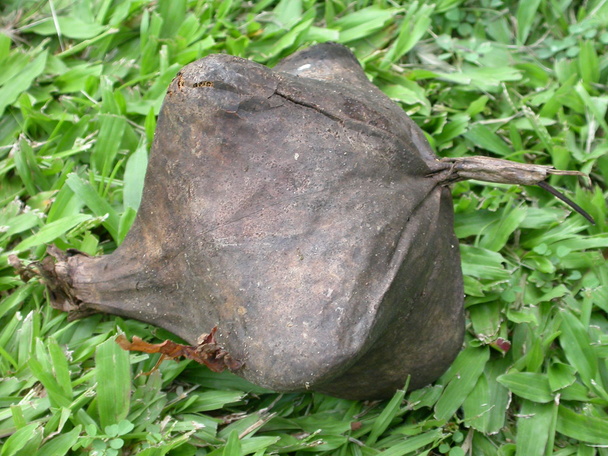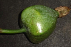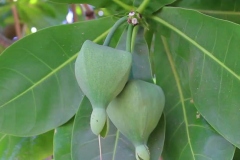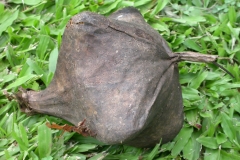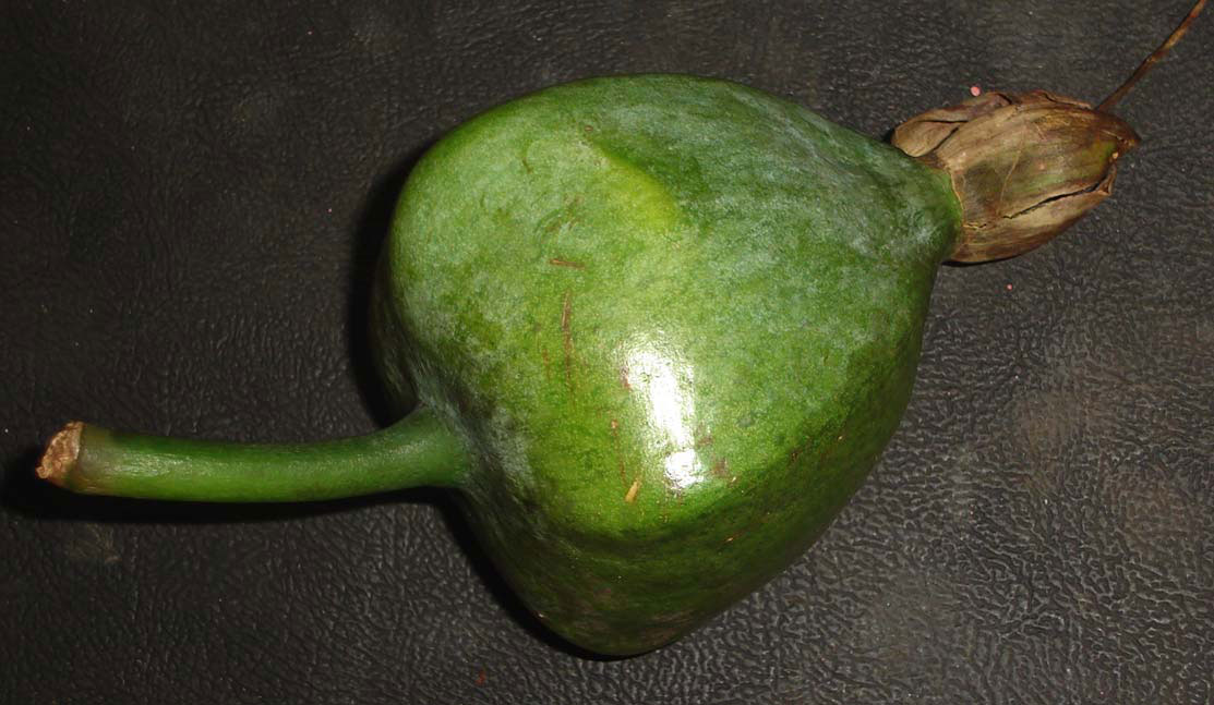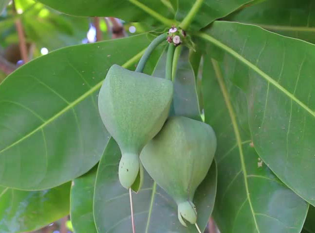 Fruits are broadly pyramidal, 4–5 angled, indehiscent, fibrous, smooth, 9–11 cm in diameter, apex tapering and crowned by calyx; pericarp spongy, fibrous. They hang from branches, and have a tough, corky-fibrous husk that aids in their dispersal by water. The fruit floats and the softer outer layers rot in the water, so the fruit is stranded on a faraway shore as a fibrous basket surrounding the seed. Fruits are green when young turning to brown as they mature. The fruit consists of seeds that are oblong, 4–5 cm long.
