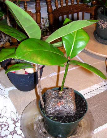 Leaves are opposite to sub-opposite, sessile, simple, dark green above, paler dull green below, obovate to obovate-oblong, 20–40 cm long and 10–20 cm wide, leathery, shiny, base cuneate, margin entire, apex obtuse or broadly rounded with pinnate venation. Young leaves may be pinkish olive with pink veins. Older leaves wither yellow or pale orange.